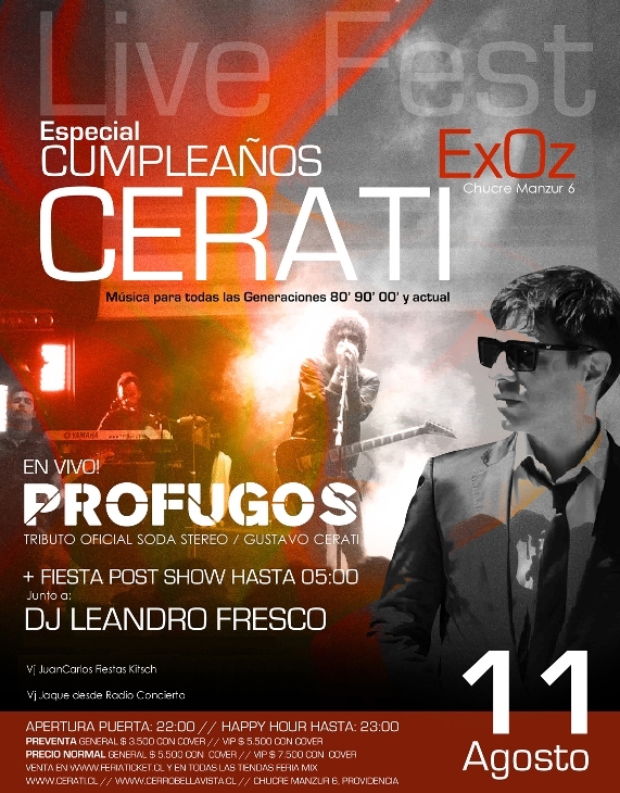 Este 11 de agosto está de cumpleaños Gustavo Cerati es por esto que su Banda Oficial, "Prófugos" ha querido celebrar en la Ex Oz un mágico recorrido en el tiempo con lo mejor de su música. Pero las sorpresas no terminan acá, porque como invitado especial la banda ha querido contar con la presencia de Leandro Fresco su tecladista y gran amigo, para repasar la mejor música de Soda Stereo en versiones remezcladas junto a nuestro DJ Jaque desde Concierto.