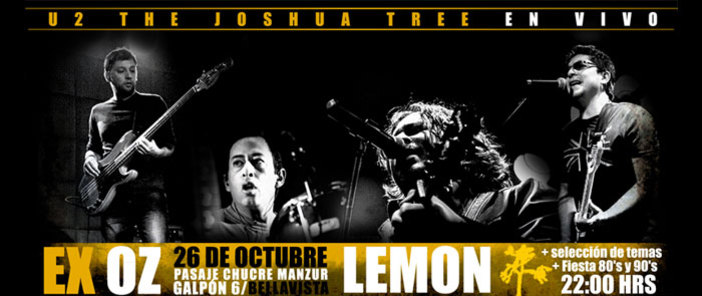 Agenda Concierto Tributo a U2 Por Benjamín Liberona León | 25 Oct, 2012. 17:59 hrs Este viernes 26 de octubre los chicos de Lemon, tributo oficial a U2, presentan en vivo uno de los discos claves de los irlandeses. Hablamos de “The Joshua Tree”, álbum que data de 1987. La cita es a las 22 horas en el Centro de Eventos Cerro Bellavista, ubicado en Chucre Manzur 6; y la entrada tiene un valor de 7.000 pesos. Agenda Concierto Lemon U2 Concurso Havana Club Depeche Mode anuncia nuevo disco y gira para 2013 Sigue a Concierto.cl en Google Discover Recibe nuestros contenidos directamente en tu feed. Seguir en Google Contenido patrocinado