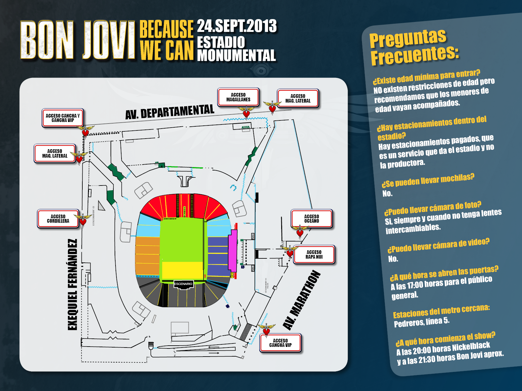 Noticias Las claves del show de Bon Jovi en Chile Por Equipo Concierto.cl | 23 Sep, 2013. 16:00 hrs Porque somos la radio oficial del concierto de Bon Jovi en Chile, a continuación te contamos las claves del show de mañana: - Bon Jovi en Chile- Estadio Monumental 24 de septiembre. - La apertura de puertas será a las 17:00 horas para el público general. - El show de Nickelback está programado para las 20:00 horas - El show de Bon Jovi está programado para las 21:00 horas. Haz click en la foto que incluye un mapa e indicaciones claves de este gran encuentro: ¡Sigue muy atento a nuestra programación con toda la información de Bon Jovi en Chile! Because We Can Bon Jovi chile Jon Bon Jovi Marco Moreno en Mañana Será Otro Día Ya tenemos ganadores entradas para Bon Jovi Sigue a Concierto.cl en Google Discover Recibe nuestros contenidos directamente en tu feed. Seguir en Google Contenido patrocinado VIDEOS RELACIONADOS Enel confirma cortes de luz en 12 comunas de Santiago para el viernes 19 de diciembre: horarios y sectores afectados Paul McCartney despide a Höfner tras su quiebra: "Es muy triste verlos cerrar" Donna Summer entra al Salón de la Fama de los Compositores y recibe el reconocimiento que siempre buscó La protagonista del video viral de la kiss cam en show de Coldplay cuenta su versión: "fue humillante"