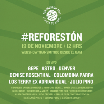 Agenda Concierto Reforestón Por Equipo Concierto.cl | 18 Nov, 2013. 22:19 hrs Este martes 19 de noviembre, el Centro Cultural Gabriela Mistral se viste de verde para dar vida a la Reforestón, una iniciativa que busca conseguir, en un solo día, 30.000 nuevos árboles para nuestra Patagonia chilena. Una invitación que contará con los show en vivo de bandas y músicos nacionales como: Gepe, Astro, Denver y Colombina Parra. Las puertas estarán abiertas para participar de 12:00 a 18:00 horas, y puedes colaborar ahora en el sitio web de Reforestemos Patagonia donando un nuevo árbol por sólo 2.000 pesos. [AUDIO] Escucha la nueva canción de Prince Revélate Sigue a Concierto.cl en Google Discover Recibe nuestros contenidos directamente en tu feed. Seguir en Google Contenido patrocinado