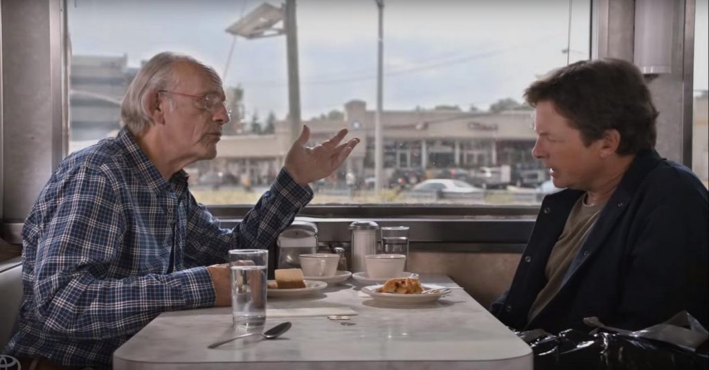Ahora Toyota subió un video con los actores Christopher Lloyd y Michael J. Fox, discutiendo qué tan certera fue la película con sus predicciones sobre el futuro. Esto es parte de una campaña más grande que será estrenada el 21 de octubre en honor a la película y también para promocionar el nuevo auto de la compañía.