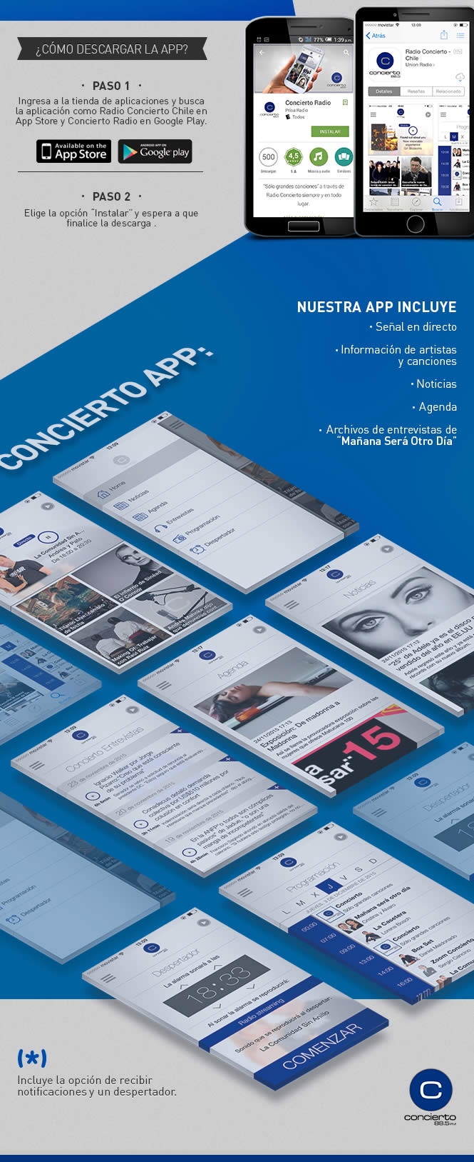 Noticias Descarga nuestra renovada aplicación para móviles Por Equipo Concierto.cl | 09 Dic, 2015. 13:23 hrs Disponible en App Store y Google Play. Nuestra app incluye: * Señal en directo. * Información de artistas y canciones. * Noticias * Agenda * Archivos de entrevistas de “Mañana Será Otro Día” Además podrás recibir notificaciones, crear playlist y un despertador para que te acompañemos desde temprano con nuestra programación de Sólo Grandes Canciones. Adele Secuela de Trainspotting confirmada para 2017 con elenco original Sigue a Concierto.cl en Google Discover Recibe nuestros contenidos directamente en tu feed. Seguir en Google Contenido patrocinado