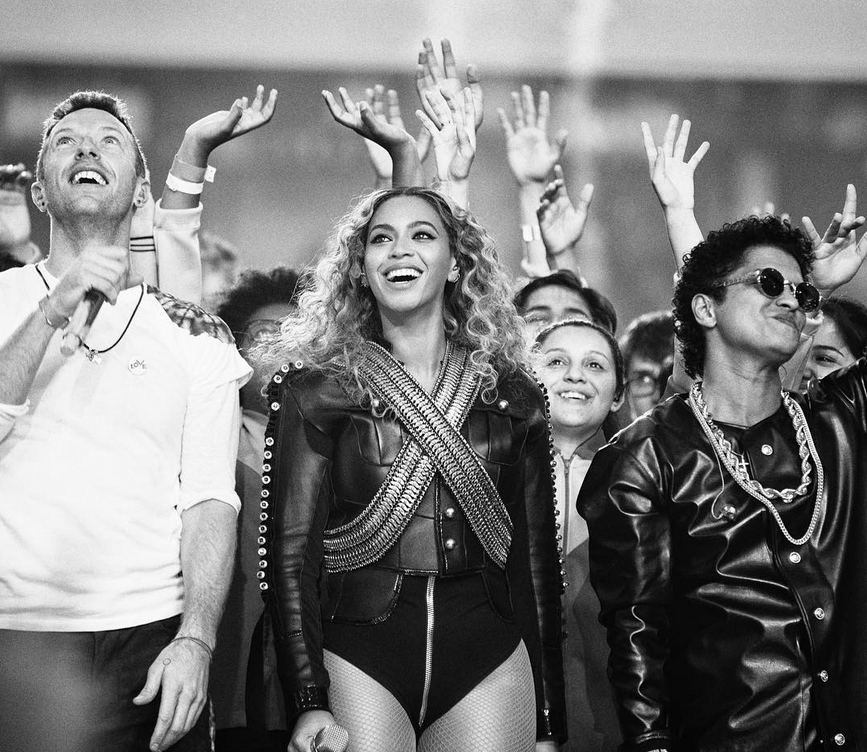 Mark Ronson, Bruno Mars y Beyoncé dieron el toque bailable del medio tiempo con las presentaciones de "Uptown Funk" y "Formation". Al final aparecieron todos juntos con una versión de "Clocks/ "Fix You" y "Up&Up".