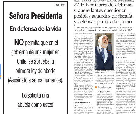 Noticias Esta es la "abuela" que publicó un inserto antiaborto en El Mercurio Por Equipo Concierto.cl | 03 Mar, 2016. 17:59 hrs Ayer en el Cuerpo C de El Mercurio apareció un inserto antiaborto, firmado por María Elena de Jesús Troncoso Delpiano que dice: "Señora Presidenta. En defensa de la vida NO permita que en el gobierno de una mujer en Chile, se apruebe la primera ley de aborto (asesinato a seres humanos). Lo solicita una abuela como usted”. Este "aviso" aparece luego que la Comisión de Constitución de la Cámara de Diputados aprobara el proyecto del Gobierno. Según El Dínamo, la "abuela" que firmó este texto, es la secretaria ejecutiva de la Comisión Nacional de Bienes Culturales de la Iglesia. Hace un tiempo atrás, esta misma mujer se dedicaba a borrar los avisos de una reconocida marca de ropa interior. En ese tiempo, María Elena opinaba que estábamos viviendo "en un neopaganismo, se están acabando todos los valores, el matrimonio para toda la vida, la pureza, el pudor de las niñitas. Estamos perdiendo eso”, aseguró a Las Últimas Noticias. Aborto tres causales Actualidad Curiosidades Brandon Flowers de The Killers se suma a Lollapalooza Jueves de vinilo: Ganador/a "1984" de Van Halen Sigue a Concierto.cl en Google Discover Recibe nuestros contenidos directamente en tu feed. Seguir en Google Contenido patrocinado VIDEOS RELACIONADOS "Whatever": el himno de libertad que Oasis lanzó como regalo de Navidad Keith Richards celebra 82 años: riffs eternos y seis décadas junto a los Rolling Stones "Avatar: Fuego y cenizas" llega a los cines con la calificación más baja de la saga Counting Crows en HBO: El documental que revela el costo de la fama tras el éxito de "Mr. Jones"