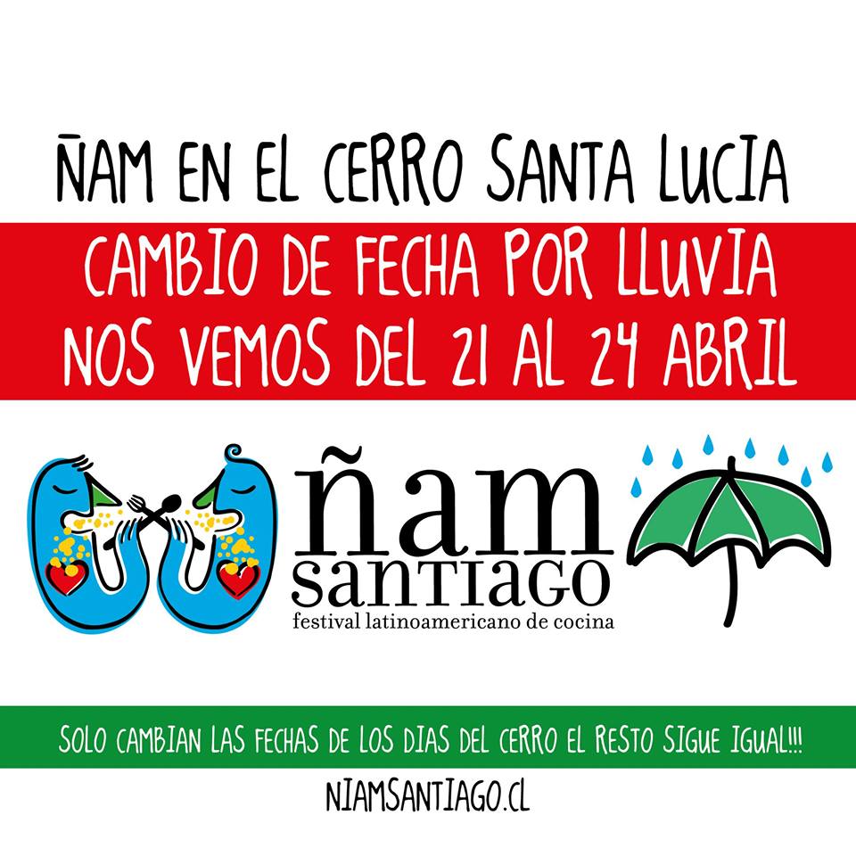 Sin embargo, debido a los pronósticos de lluvia para este fin de semana, la actividad Ñam Familiar, programada para esta semana en el Cerro Santa Lucía, cambia su fecha para los días jueves 21 hasta el domingo 24 de abril.