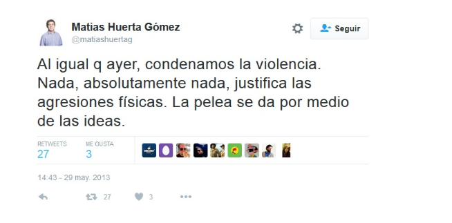 Noticias Joyas provida de Matías Huerta Por Equipo Concierto.cl | 12 Ago, 2016. 17:46 hrs En la tarde del jueves se viralizó un audio en el que se escuchaba Matías Huerta, un joven dirigente UDI, agrediendo a su ex pareja. El entonces candidato a concejal por Talca, se bajó de la carrera y también renunció a su militancia. Huerta cerró su cuenta de Twitter, donde dejaba sus ideas sobre la delincuencia, el aborto y la violencia. El sitio Gamba recopiló algunos de sus mensajes más ideológicos: Actualidad Los Sin Anillo ¡Feliz cumpleaños PC! ¿Un nuevo dúo? Noel Gallagher almorzó con un reconocido actor en el sur de Francia Sigue a Concierto.cl en Google Discover Recibe nuestros contenidos directamente en tu feed. Seguir en Google Contenido patrocinado