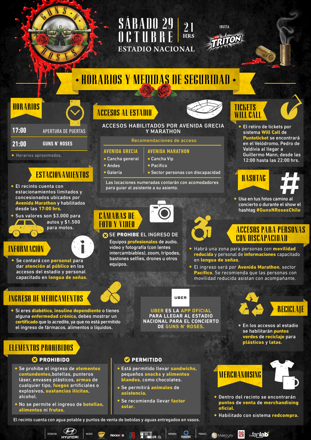 Este sábado 29 de octubre Guns N' Roses regresa al Estadio Nacional, con 3 de sus miembros originales. En Concierto te informamos sobre coordenadas, horarios y otros detalles para que no te pierdas ni un segundo de este gran y esperado show.