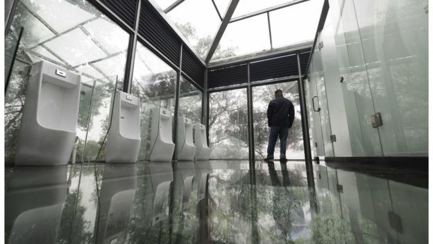 Lo curioso es que las cabinas individuales no sólo permiten gozar de la magnífica vista del bosque y el lago, también permiten observar con claridad a las cabinas vecinas y a las otras personas que están usando el baño. Y si bien las puertas de los cubículos son templados y hay una separación entre hombres y mujeres, el cristal que los separa no deja mucho a la imaginación.