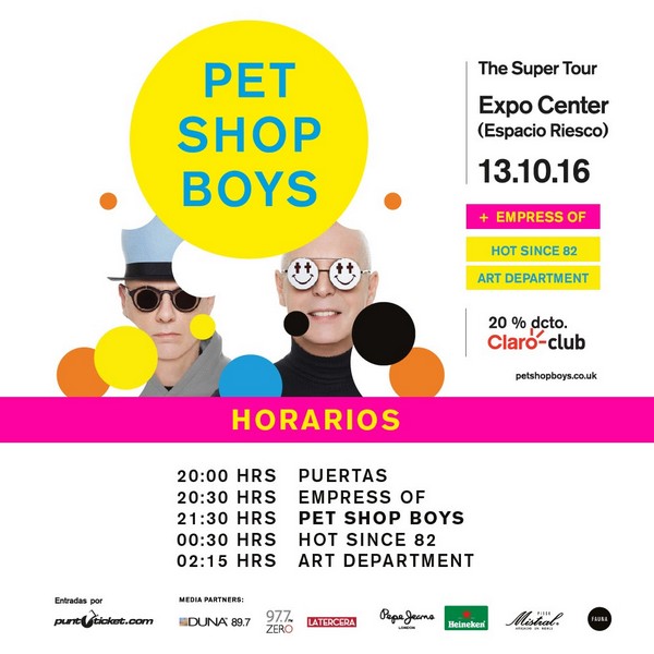 El dúo británico Pet Shop Boys ya está en Chile preparando todo para su show de este jueves 13 de octubre en la Expo Center de Espacio Riesco. Y para quienes ya tienen asegurada su entrada, les contamos que ya se dieron a conocer los horarios de la apertura de puertas, y los shows que antecederán la presentación.