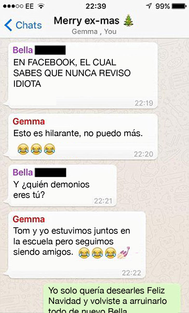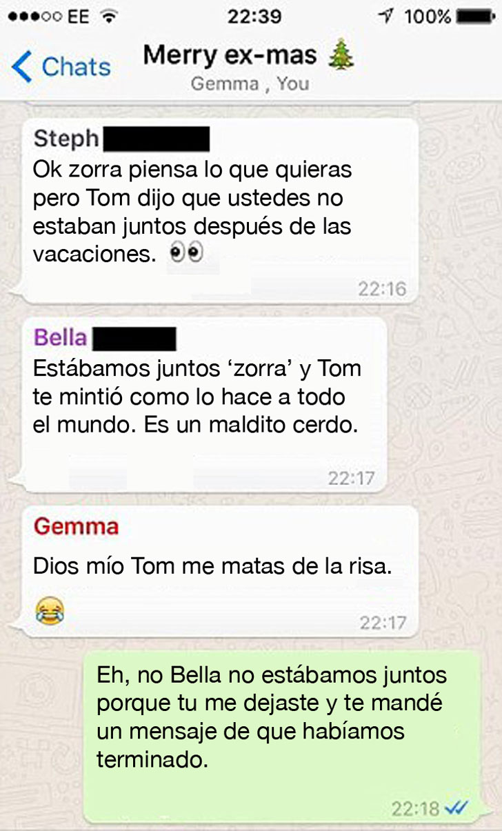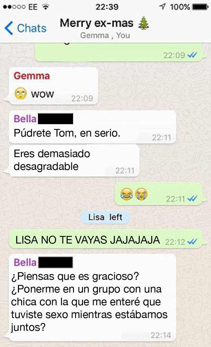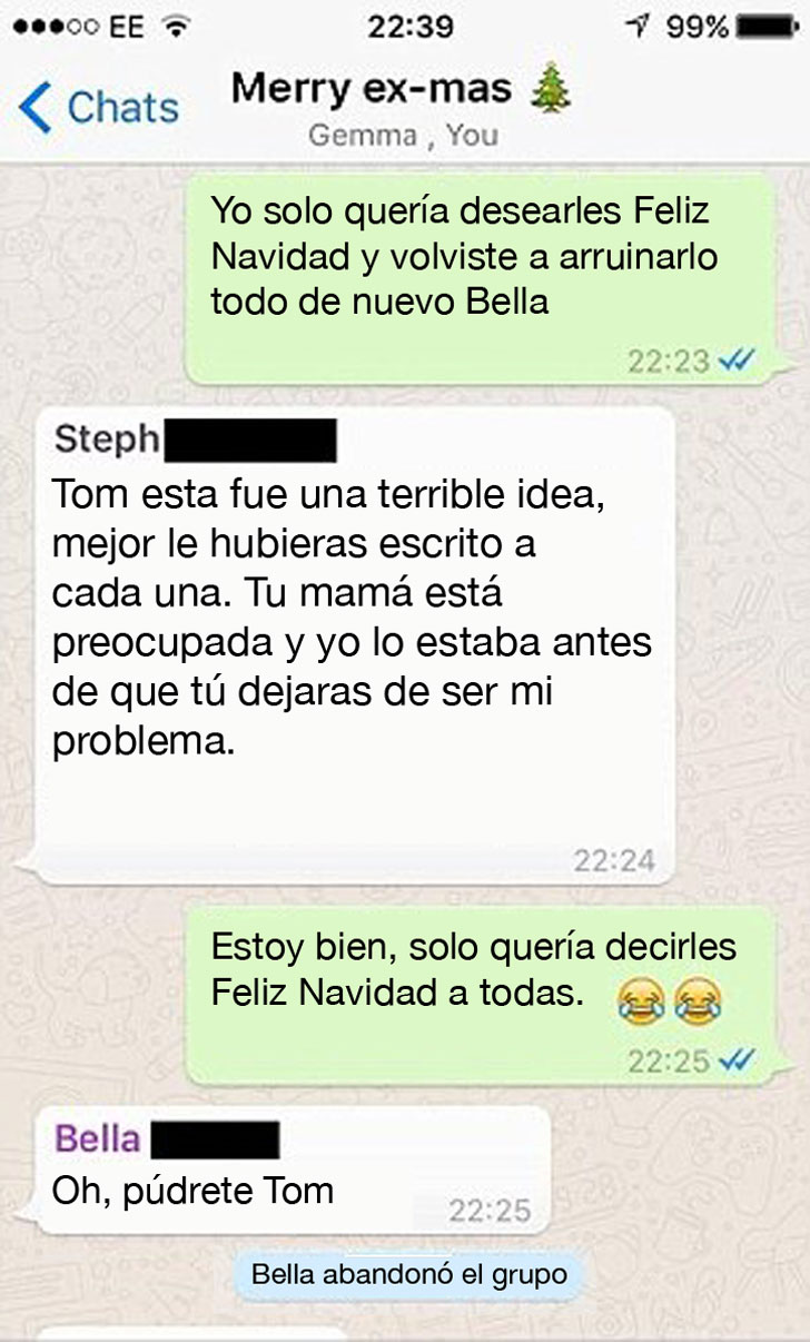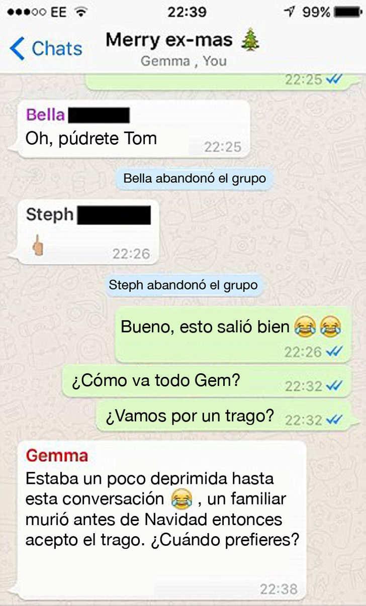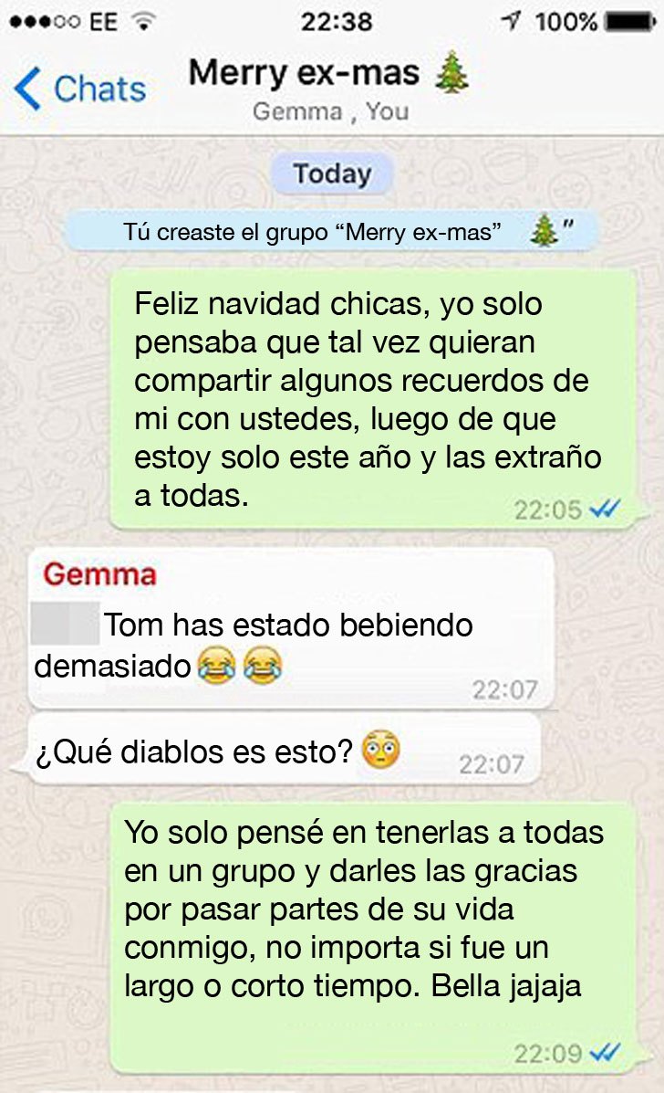 Noticias Agregó a todas su ex en un grupo whatsapp como aviso de utilidad pública Por Equipo Concierto.cl | 28 Nov, 2016. 17:31 hrs Esta es la historia de un joven llamado Tom, a quien por razones que desconocemos decidió agregar a todas sus ex parejas en un grupo titulado "Merry ex-mas", para recordar los buenos momentos que compartieron. Y mientras algunas optaron por ignorar la invitación y simplemente salir del grupo, otras prefirieron insultarlo por lo desubicada de la ocurrencia. Pese a todo lo que pasó dentro de ese grupo, la idea tendría un final inesperado. Aquí la conversación: Curiosidades navidad Viral Estudio: la salud se puede medir según el tamaño del trasero Ganadores de las funciones en IN-EDIT NESCAFÉ Sigue a Concierto.cl en Google Discover Recibe nuestros contenidos directamente en tu feed. Seguir en Google Contenido patrocinado