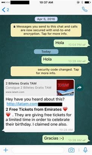 Noticias Atent@s con el nuevo fraude de WhatsApp Por Equipo Concierto.cl | 11 Nov, 2016. 10:41 hrs Ojo con los links que te manden a WhatsApp, especialmente con este último que están investigando en los Kaspersky Lab y que ofrece viajes en avión gratis a Emiratos Árabes Unidos. Este es un mensaje que te llega a tu teléfono donde te indican que la aerolínea TAM está regalando pasajes para celebrar el aniversario de la empresa. Si ingresas al enlace, aparecerá una encuesta falsa y así toman tus datos, que luego son utilizados para difundir otros elementos maliciosos como spam o virus informáticos. Curiosidades Viral Whatsapp Artistas lamentan la partida de Leonard Cohen Gerd Rath, jubilado: "Este sistema yo lo detesto, pero dentro de lo que me pasó a mí" Sigue a Concierto.cl en Google Discover Recibe nuestros contenidos directamente en tu feed. Seguir en Google Contenido patrocinado