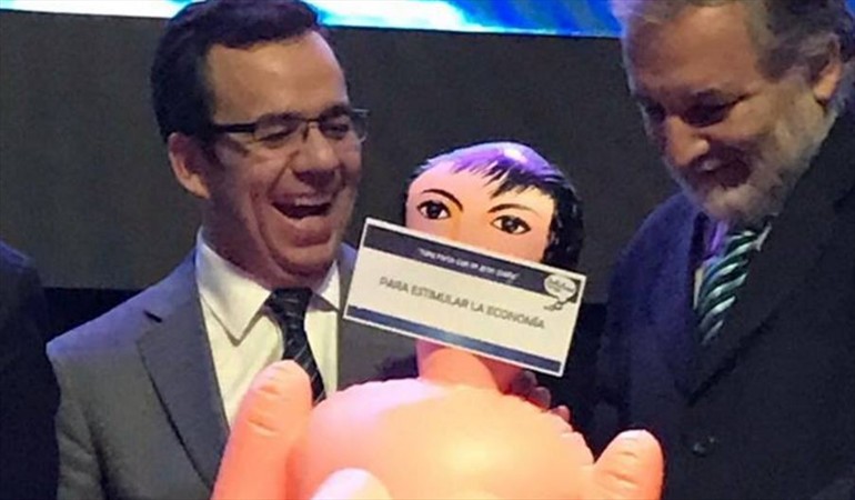La muñeca inflable tenía un mensaje en la boca en el que se leía “para estimular la economía", aludiendo a que la economía “es como las mujeres, hay que estimularlas”.