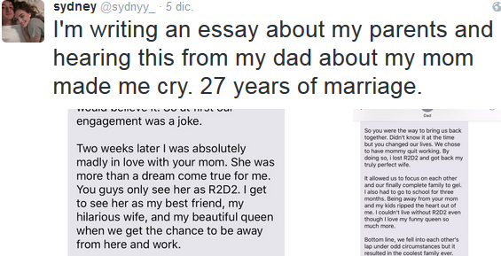 I'm writing an essay about my parents and hearing this from my dad about my mom made me cry. 27 years of marriage. pic.twitter.com/27muq07Xpz