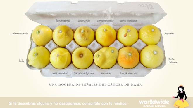 “Conoce tus limones. Ellos te pueden enseñar mucho sobre el cáncer de mama”. Ese es el eslogan de una campaña mundial contra el cáncer de mama diseñada por la Dra. Corrine Ellsworth Beaumont, fundadora y directora de Worldwide Breast Cancer, con la que se busca explicar 12 signos visibles (o palpables) que pueden ser indicios de un cáncer de mama y que van más allá del típico bulto. La idea de Corrine era graficarlo de la manera más amigable posible ¿Cómo lo hizo? A través de limones.