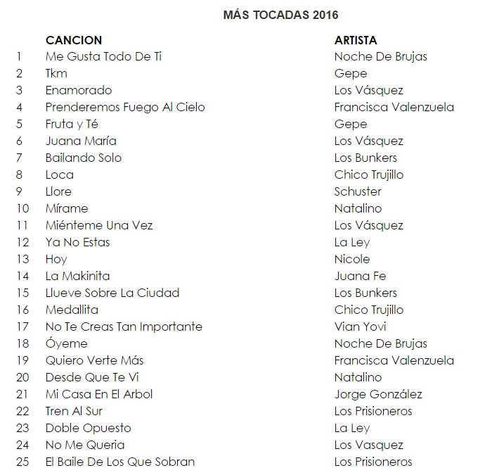 Noticias Estas fueron las 25 canciones chilenas más escuchadas en las radios en 2016 Por Equipo Concierto.cl | 04 Ene, 2017. 11:30 hrs Este martes la Sociedad Chilena del Derecho de Autor (SCD) publicó el listado de las canciones chilenas más programadas en las radios durante 2016. El ranking fue elaborado con el sistema de medición BMAT – VERICAST que maneja la organización, y que monitorea alrededor de 400 emisoras a lo largo del territorio. Así, entre las más escuchadas aparecen piezas de Gepe ("TKM", "Fruta y Té"), Francisca Valenzuela ("Prenderemos fuego al cielo", "Quiero verte más"), Los Bunkers ("Bailando solo", "Llueve sobre la ciudad"), y La Ley ("Ya no estás", "Doble opuesto"). Francisca Valenzuela Gepe Los Bunkers Música "Fuck off": Alexis Sánchez tuvo día de furia bilingüe en el Arsenal Charles Manson, el famoso asesino en serie, se encuentra grave en el hospital Sigue a Concierto.cl en Google Discover Recibe nuestros contenidos directamente en tu feed. Seguir en Google Contenido patrocinado VIDEOS RELACIONADOS "Whatever": el himno de libertad que Oasis lanzó como regalo de Navidad Keith Richards celebra 82 años: riffs eternos y seis décadas junto a los Rolling Stones "Avatar: Fuego y cenizas" llega a los cines con la calificación más baja de la saga Counting Crows en HBO: El documental que revela el costo de la fama tras el éxito de "Mr. Jones"