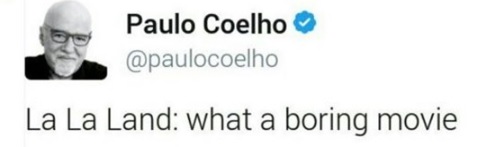 Noticias Paulo Coelho criticó a "La La Land" y Twitter no lo perdonó Por Equipo Concierto.cl | 30 Ene, 2017. 17:29 hrs Todo apunta a que "La La Land" será la cinta de la temporada: ha sido ampliamente elogiada por la crítica y los espectadores, es la gran favorita de los Oscar y arrasó en la anterior entrega de los Globos de Oro. Sin embargo, la producción protagonizada por Emma Stone y Ryan Gosling también ha tenido detractores, siendo el último de ellos Paulo Coelho. El autor de "El Alquimista" publicó en redes sociales que la cinta "es aburrida", aunque el tiro le salió por la culata: Twitter lo atacó sin piedad, e incluso varios cuestionaron la calidad de su prosa. El brasileño debió borrar el mensaje, aunque las reacciones en su contra no han cesado: mira algunas a continuación: El turras insoportable de Paulo Coelho diciendo que La la land es aburrida. No se lee él a sí mismo, por lo visto. — David Ruiz (@DavidDepain) 27 de enero de 2017 Jajajajajajajajaja ha borrado lo de La La Land y los otros tuits donde nombraba musicales mejores. Imbéeeeeecil @paulocoelho — Juan. (@Lagartman_) 27 de enero de 2017 Paulo Coelho la la land es más entretenida que todos sus fuckings libros — Paola villalobos (@PaoPaovarela) 30 de enero de 2017 Si veo La La Land y no me gusta, coincido con Paulo Coelho. ¿Qué pensáis? ¿Me suicido entonces? — SuperSantiEgo (@SuperSantiEgo) 30 de enero de 2017 Que Paulo Coelho dijo que La la land está aburridísima... #amiko pic.twitter.com/RPK7xBPOF0 — tan contreras (@taaancontreras) 28 de enero de 2017 Paulo Coelho dice que La La Land le pareció aburrida. Yo digo todo lo contrario: Es una hermoso musical digno del Hollywood de antaño. — Marcio Vargas (@marciocandangan) 29 de enero de 2017 Qué descaro de @paulocoelho decir que La La Land es aburrida cuando sus "obras" son realmente una mierda. #PúdretePaulo — Heisenberg (@HeinsenbergL) 28 de enero de 2017 Curiosidades La La Land Viral Ed Sheeran lanza videoclip para "Shape of you" Comenzaron los rodajes de la película de Han Solo Sigue a Concierto.cl en Google Discover Recibe nuestros contenidos directamente en tu feed. Seguir en Google Contenido patrocinado