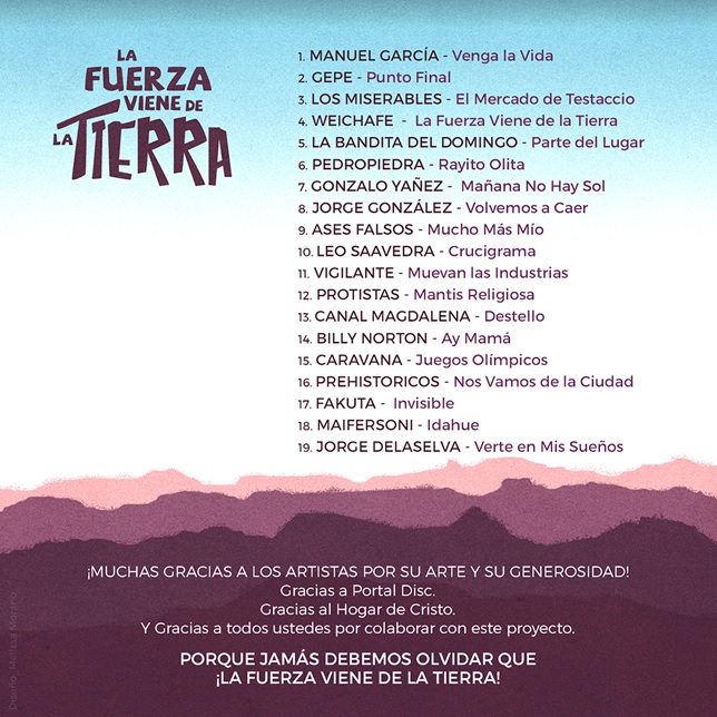 Noticias Revisa el tracklist de "Porque la fuerza viene de la tierra" el disco que ayudará a los damnificados por incendios Por Equipo Concierto.cl | 14 Feb, 2017. 13:21 hrs Este miércoles 15 de febrero, a partir de las 12.00 horas, estará disponible en Portal Disc, por un valor de $3.990, el disco "Porque la fuerza viene de la tierra", que reúne a una serie de músicos tanto conocidos como emergentes para ir en ayuda de los damnificados por los incendios forestales. Y ya tenemos un avance del lo que va a ser el arte y tracklist definitivo de este álbum: El total de lo recaudado por las ventas ira directamente al Hogar de Cristo, para ser entregado a damnificados por los incendios que azotaron nuestro país. Gepe incendios forestales Jorge González manuel garcía Música Le llueve sobre mojado: Alanis Morissette sufrió millonario robo de joyas Los pros y contras de encontrar el amor en el trabajo Sigue a Concierto.cl en Google Discover Recibe nuestros contenidos directamente en tu feed. Seguir en Google Contenido patrocinado