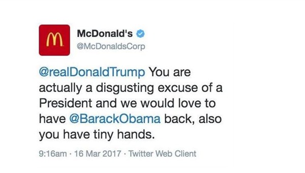 La cuenta oficial de Twitter de McDonald's se refirió en duros términos al presidente de los Estados Unidos Donald Trump.