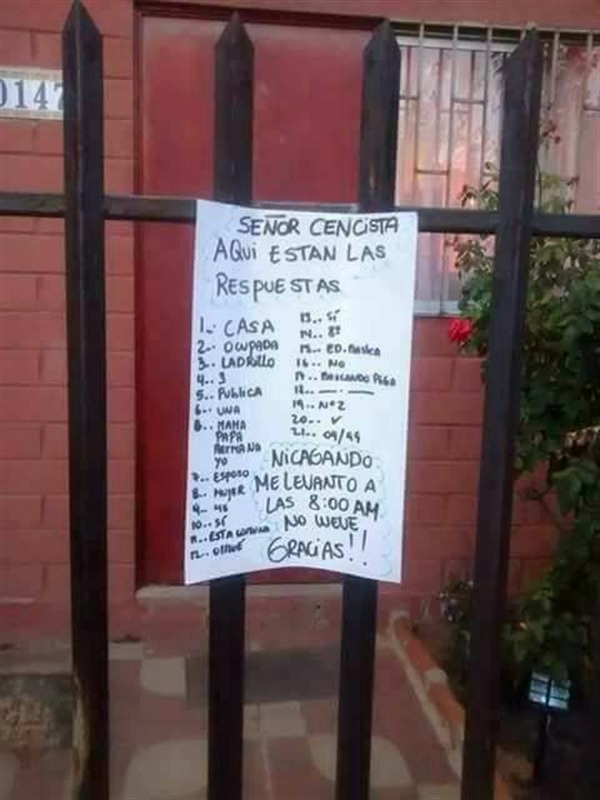 Otra imagen que sacó risas vino de una familia que no estuvo muy de acuerdo con el horario en que empezó la medición: en la reja de su hogar, dejaron un cartel con las respuestas y un claro mensaje: Ni cagando me levanto a las 8:00 am, no wevee (sic) Gracias".