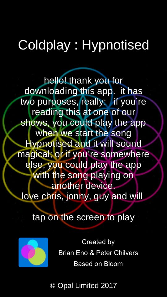 Noticias Brian Eno lanza aplicación para la canción “Hypnotised” de Coldplay Por Equipo Concierto.cl | 15 Jun, 2017. 11:22 hrs Opal Limited, una compañía creada por el compositor Brian Eno y el músico Peter Chilvers, acaba de lanzar una aplicación del tema de Coldplay “Hypnotised”. La herramienta planea mostrarnos una experiencia diferente al escuchar “Hypnotised”, al momento que la banda la toque en alguno de sus conciertos o sea reproducida desde otro dispositivo, una melodía comenzará a reproducirse a la par del piano, acompañada de algunos coloridos visuales similares al arte oficial de su último disco. Te dejamos algunas capturas de la aplicación incluyendo el mensaje cortesía de Coldplay con las instrucciones oficiales: Música Insólito: Regalaron artículos de aseo a mujeres en funciones de Wonder Woman Yoko Ono será acreditada como coautora de “Imagine” Sigue a Concierto.cl en Google Discover Recibe nuestros contenidos directamente en tu feed. Seguir en Google Contenido patrocinado VIDEOS RELACIONADOS U2 y "How to Dismantle an Atomic Bomb": a 21 años de su conquista en Reino Unido "Band on the Run" de Wings: 52 años del álbum que consolidó a Paul McCartney más allá de The Beatles Seal anuncia "Purpose", su película concierto que celebra 30 años de sus álbumes clásicos Scott Weiland vuelve a sonar: lanzan "If I Could Fly" a 10 años de su fallecimiento