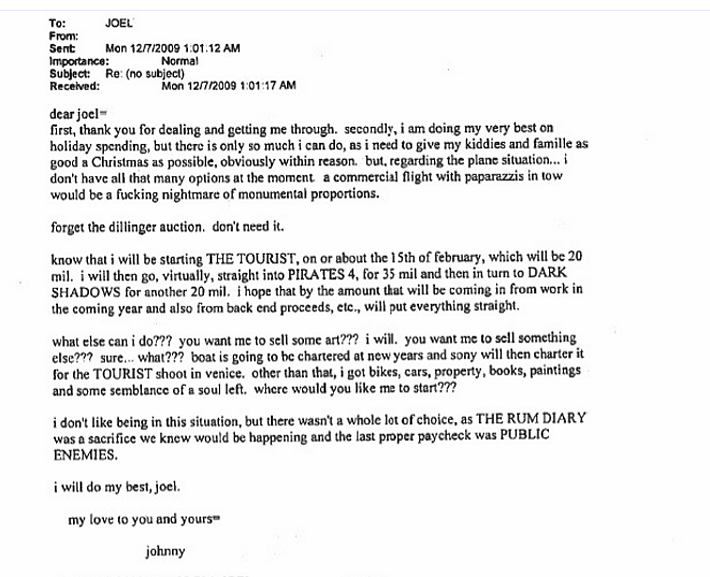 El actor, de 54 años, intentó mantener la calma de sus representantes económicos y les advirtió de que tenía previsto empezar el rodaje de The Tourist (2010), película por la que recibió 20 millones de dólares; y que luego llegarían otros proyectos como la continuación de la saga de Piratas del Caribe, con la que ganó 35 millones, o Sombras Tenebrosas, que supuso 20 millones más para sus arcas. “Espero que la cantidad que llegue del trabajo el próximo año y los ingresos finales puedan poner todo en orden”, añadió el intérprete.