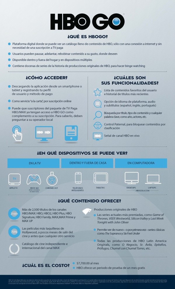 HBO GO permitirá ver en vivo el canal y también revisar otro contenido icónico del canal en alta definición, como The Wire, Los Soprano, Game of Thrones y Westworld. Además, tendrá las series que la cadena realizó en América Latina, como Epitafios, El Negocio o el Sr. Ávila.