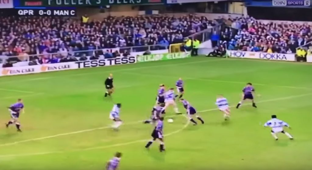 La secuencia, que parece sacada de una comedia, corresponde a un duelo de la FA Cup de Inglaterra entre el Manchester City y el Queens Park Rangers, el 23 de enero de 1993.