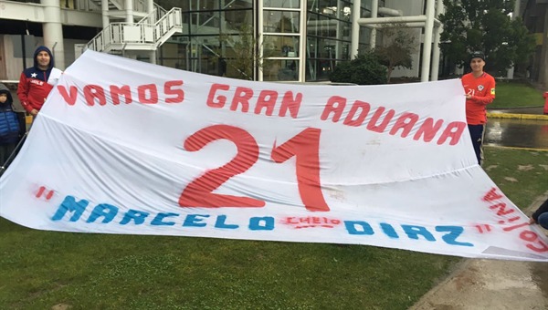 Noticias El lienzo con el que los hinchas recibieron a Marcelo Díaz en el aeropuerto Por javier valladares | 04 Jul, 2017. 10:40 hrs Este martes arribó la selección chilena tras su periplo por la Copa Confederaciones, torneo en el que fueron finalistas y cayeron ante Alemania. Al aeropuerto de Santiago llegó un grupo de hinchas para brindarle su apoyo al combinado nacional, en especial al volante Marcelo Díaz, quien cometió un grueso error en el duelo ante los campeones del mundo, y que terminó sellando la suerte de Chile en la competición. Un puñado de seguidores llevó un lienzo para recibir a "Carepato", el que tiene al medio el número 21 —dorsal de Díaz— y la consigna "Vamos Gran Aduana", en alusión al desempeño en el campo del ex Universidad de Chile. Apoyo para Marcelo Díaz a esta hora en el aeropuerto. pic.twitter.com/WeV7tlg0MK — Rodrigo Ried (@vaqueroried) 4 de julio de 2017 Fotografía de ADN Radio. La Roja Joven bailó arriba de un furgón de Carabineros al ritmo de Michael Jackson Directora de Fonasa por polémica de centros de diálisis: “Existen pruebas de que se coludieron” Sigue a Concierto.cl en Google Discover Recibe nuestros contenidos directamente en tu feed. Seguir en Google Contenido patrocinado