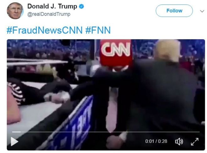 En su cuanta oficial Trump publicó un video con el hashtag #FraudNewsCNN y #FNN, de cuando participó en el Wrestlemania de la WWE, y "peleó" contra Vince McMahon, pero cambia su rostro por el logo de CNN.