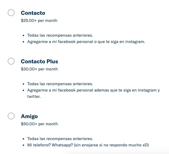 A través de Patreon —sitio que busca financiamiento a cambio de premios e incentivos—, el joven chileno prometía, por ejemplo, "agregarme a mi facebook personal o que te siga en Instagram" por 25 dólares al mes, mientras que por 50 dólares al mes compartía su WhatsApp. El mayor "premio" tenía un costo de 200 dólares mensuales, y aquel que lo pagara se convertiría en "amigo" del youtuber.