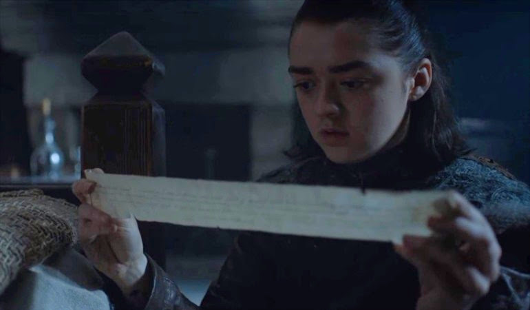 En el capítulo el personaje de Maisie Williams se escabulló al interior de la pieza de Meñique, donde encontró un misterioso mensaje firmado por Sansa. Para entender el mensaje debemos transportarnos a la primera temporada, poco después del arresto de Ned Stark. Cersei obligó a Sansa a escribir una nota para su hermano Robb, rogándole que se arrodillara ante el nuevo sucesor del trono, Joffrey.