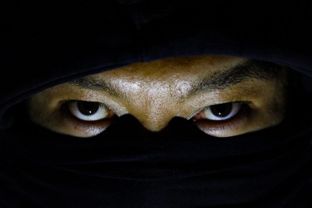 Close up of a asian man wearing a ninja mask.