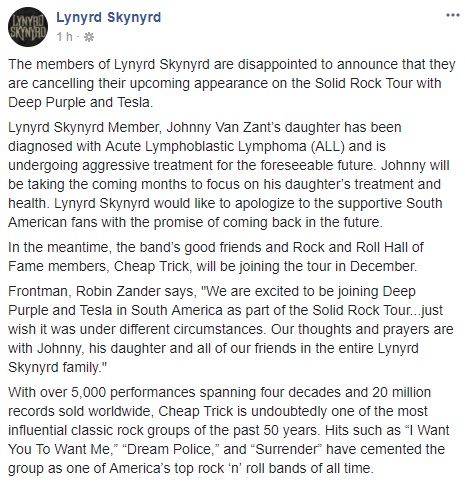 En su reemplazo entrarán los también estadounidenses Cheap Trick. "Estamos entusiasmados de unirnos a Deep Purple y Tesla en la parte sudamericana del Solid Rock Tour", dijo su vocalista Robin Zander. "Me hubiese gustado que fuese en otras circunstancias. Nuestros pensamientos están con Johnny, su hija y todos nuestros amigos en la familia Lynyrd Skynird".