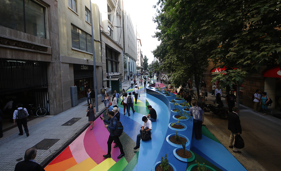 La intervención urbana abarca desde Moneda a Compañía, con distintos espacios unidos por una pintura en el suelo de una extensión de 3.300 metros cuadrados.