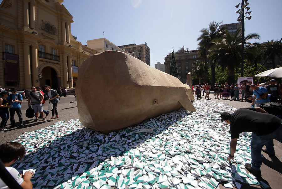 El lanzamiento oficial se realizó en la Plaza de Armas de Santiago, donde se instaló una ballena gigante que nadaba en libros. La intervención contó con la participación de Francisco Ortega, escritor detrás de Mocha Dick, quien conversó con los transeúntes sobre las ballenas en la literatura y les entregó tips de escritura, y Blanca Lewín, quien realizó una lectura dramatizada de una selección de los mejores cuentos de Santiago en 100 Palabras.
