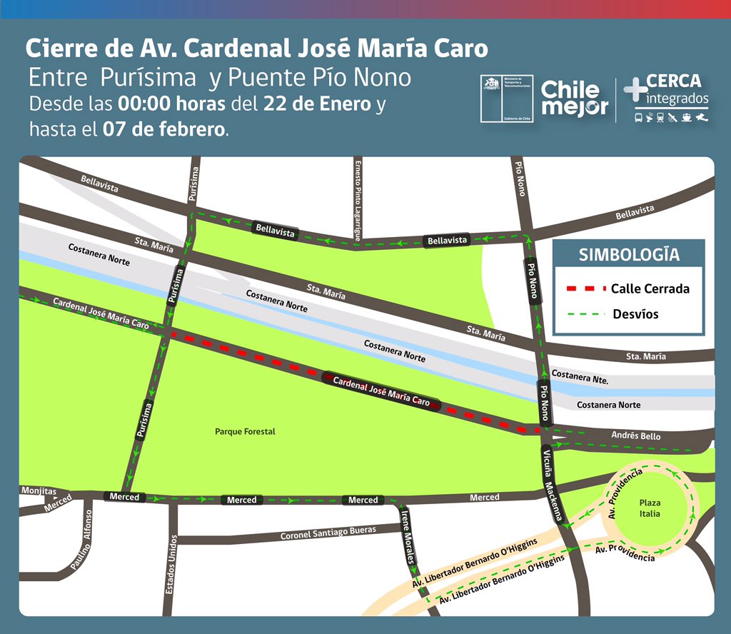 Según la infografía publicada, quienes circulen de oriente a poniente deberán tomar la calle Pío Nono hacia el norte, seguir por Bellavista y volver a Cardenal Caro por Purísima.