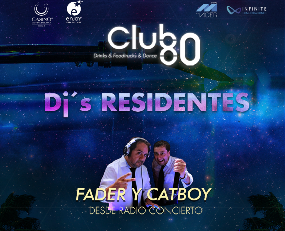 Atención en Viña del Mar y Valparaíso porque hasta el ENJOY Casino Viña del Mar llegarán nuestros DJs Fader y Catboy, este viernes 12 de enero. La dupla estará a cargo de las máquinas en la primera fecha del Summer tour 2018 de Club 80, que también contará con el show de Eleven 2, tributo a U2.