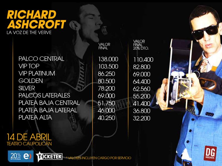 Los boletos para el espectáculo se encuentran disponibles bajo sistema Ticketek, con precios que oscilan entre los $40.250 y los $138 mil, cargo por servicio incluido. Clientes Entel cuentan con un 20% de rebaja en su boleto.