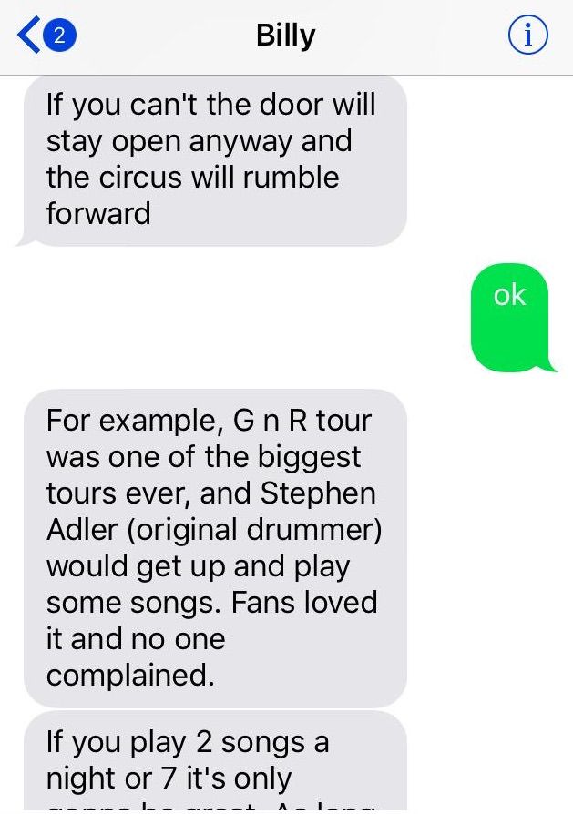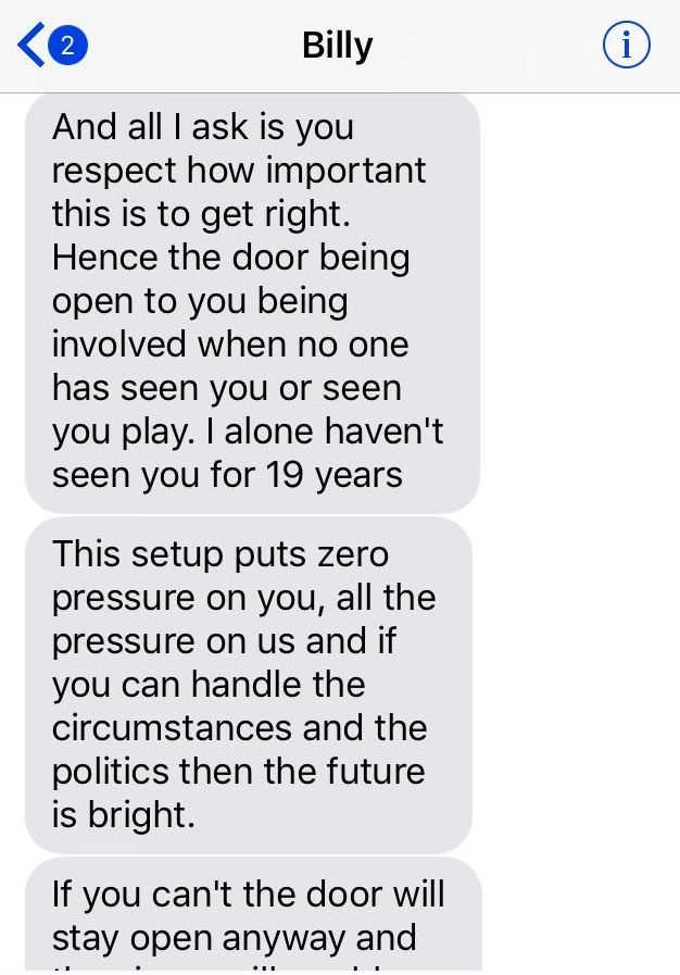 En otro texto, Corgan le propone a Wretzky que sea parte de la reunión tal como Steve Adler lo hizo en la gira de Guns N'Roses, con apariciones esporádicas. Finalmente, la bajista le explica que no necesita operación pero el cantante le cuenta que su lugar lo tomará Jack Bates, el hijo de Peter Hook.