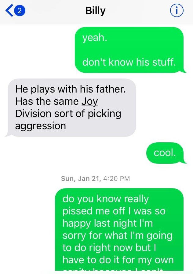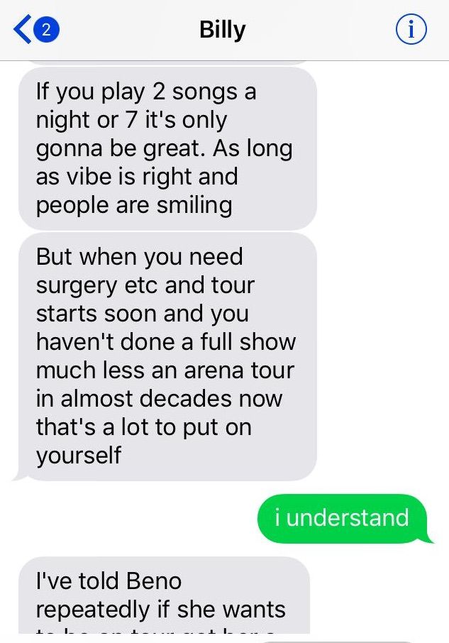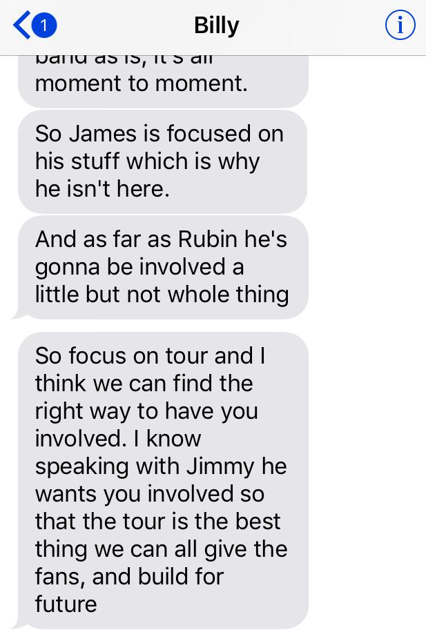 En los pantallazos, que puedes revisar en el sitio Alternative Nation, se puede ver cómo Corgan le ofreció a Wretzky ser parte de la gira de reunión —cuando ya estaban en el estudio, sin ella—, relegándola solo a tocar el bajo. Luego esta le comenta que primero debe superar un problema en su hombro, que podría tomarle de "4 a 6 semanas", y ahí el tono de la conversación cambia.