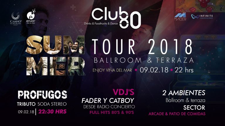 Concursos Ganadores de invitaciones para la fiesta Club 80 en Enjoy Viña del Mar Por javier valladares | 05 Feb, 2018. 12:33 hrs Concurso Cerrado Si quieres disfrutar con la mejor música de los años ochenta, en Concierto te invitamos a un panorama ideal en la Quinta Región. Deja tus datos datos a continuación y estarás participando por invitaciones para la fiesta Club 80 en el Enjoy de Viña del Mar, con nuestros DJ's Catboy y Fader y Prófugos, tributo a Soda Stereo. Felicitamos a l@s ganador@s: Jorge López Olguin Paula Gutiérrez Cortés Karla Reyes Olguin Bastián Fuentes Acevedo Leslie Martínez Concurso Soledad Larraín, del Consejo nacional de la infancia, analiza el caso Sophia Murió Margot Duhalde, la piloto chilena que combatió a los nazis Sigue a Concierto.cl en Google Discover Recibe nuestros contenidos directamente en tu feed. Seguir en Google Contenido patrocinado