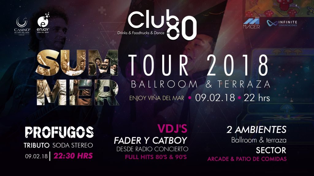 Deja tus datos datos a continuación y estarás participando por invitaciones para la fiesta Club 80 en el Enjoy de Viña del Mar, con nuestros DJ's Catboy y Fader y Prófugos, tributo a Soda Stereo.