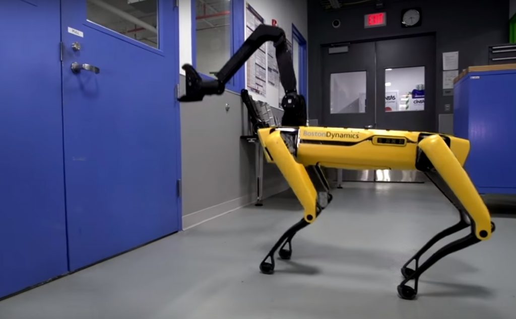 En el clip se puede ver como uno de los perros, llamados SpotMini, se enfrenta a una puerta cerrada. Al darse cuenta que no puede avanzar, aparece otro con un brazo extra y logra abrirla, y ambos salen de la habitación.