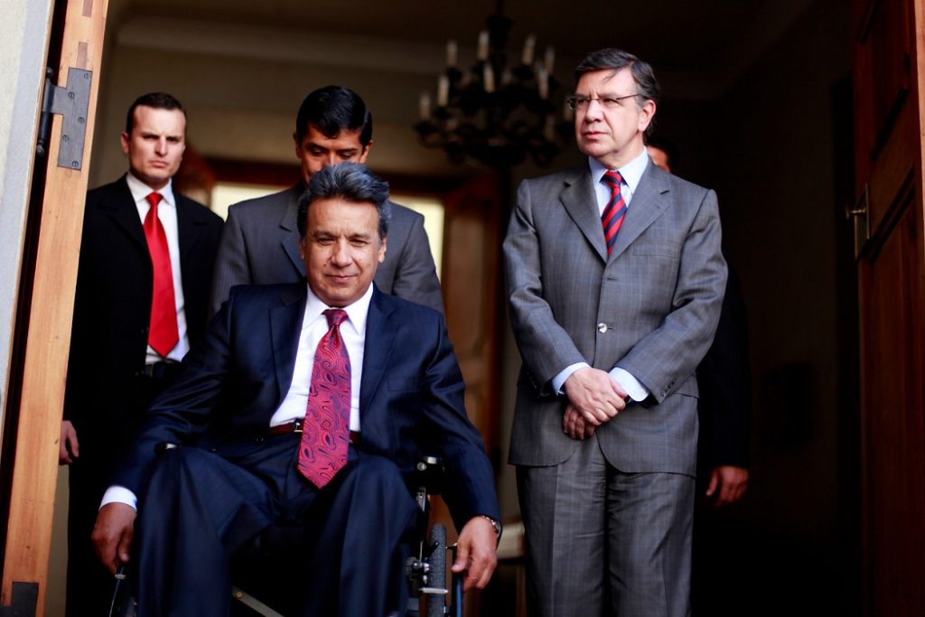 Moreno se trasladaba en silla de ruedas luego de ser baleado en un asalto en 1998 y lograr ser el único jefe de Estado parapléjico en el mundo, asumiendo el año pasado como máxima autoridad ecuatoriana. Por su parte, Juan Carlos I está con muletas por su avanzada edad. Por lo que ambos tuvieron que entrar por un costado a la ceremonia.