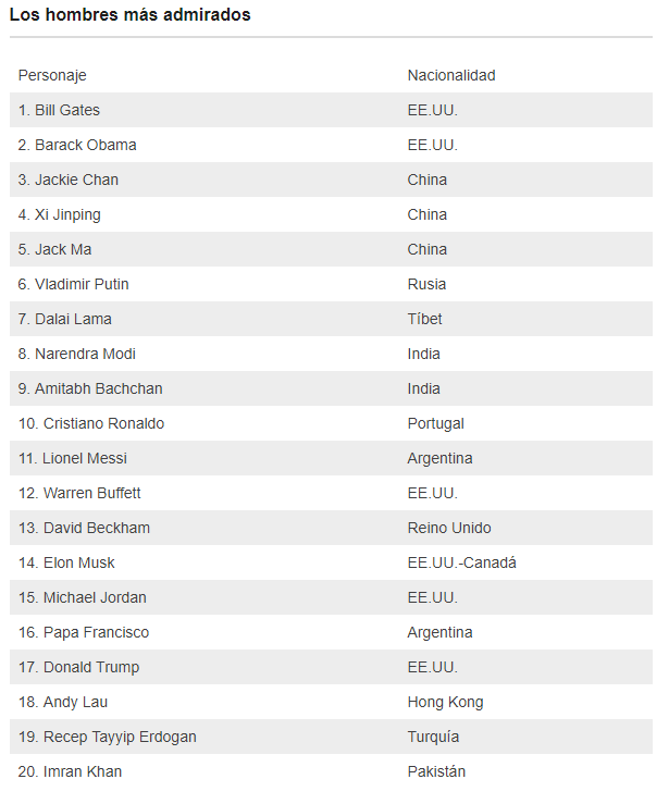 Mientras que el listado masculino ubicó al fundador de Microsoft, de 62 años, por encima del líder religioso Dalai Lama y el expresidente de Estados Unidos, Barack Obama.