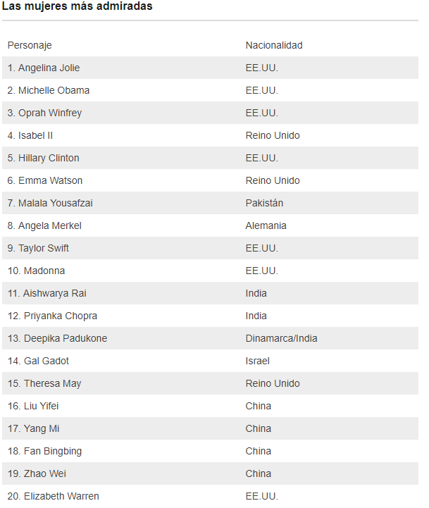 El portal de análisis y encuestas británico YouGov realizó una encuesta a 37 mil personas de 35 países del mundo para determinar quiénes eran las figuras públicas más admiradas del planeta. Las listas divididas en hombres y mujeres ubicaron a Angelina Jolie y Bill Gates al tope.