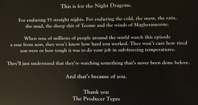 Noticias Game of Thrones: Octava temporada tendrá batalla que se filmó en 55 días Desde la serie prometen que en el ciclo final de la ficción mostrará "algo que nunca antes se había hecho". Por javier valladares | 10 Abr, 2018. 10:21 hrs Falta más de un año para el estreno de la octava temporada de Game of Thrones, y el ciclo aparentemente tendrá la batalla más épica de la ficción. En las últimas horas se ha viralizado una nota de la producción de la serie de HBO, donde se agradece a las personas que participaron de la grabación de una secuencia de guerra que se filmó durante 55 noches seguidas. Sí, 55 noches seguidas. Como parámetro, algunas de las batallas más impresionantes de Game of Thrones, como el enfrentamiento entre Jon Snow y Ramsay Bolton de la sexta temporada, tomó un mes en grabarse. "Esto es por los Dragones de la Noche", dice la nota. "Cuando diez millones de personas alrededor del mundo vean este episodio en un año más, nunca sabrán lo duro que trabajaron. No les importará lo cansados que estaban o cómo fue trabajar en temperaturas bajo cero. Ellos sólo entenderán que están viendo algo que nunca antes se había hecho", añade. La nota fue publicada en Instagram por el director asistente Jonathan Quinlan. Game Of Thrones Hackers eliminaron “Despacito”, el video más visto de la historia de YouTube The Cure vuelve al estudio: Robert Smith anunció que escribió nuevas canciones Sigue a Concierto.cl en Google Discover Recibe nuestros contenidos directamente en tu feed. Seguir en Google Contenido patrocinado VIDEOS RELACIONADOS U2 y "How to Dismantle an Atomic Bomb": a 21 años de su conquista en Reino Unido "Band on the Run" de Wings: 52 años del álbum que consolidó a Paul McCartney más allá de The Beatles Seal anuncia "Purpose", su película concierto que celebra 30 años de sus álbumes clásicos Scott Weiland vuelve a sonar: lanzan "If I Could Fly" a 10 años de su fallecimiento