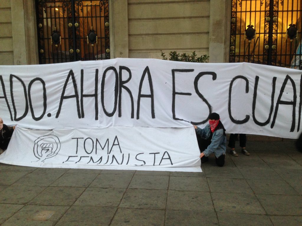 Cerca de 100 alumnas se tomaron la casa central de la Pontificia Universidad Católica, en avenida Alameda con Portugal, comuna de Santiago. A eso de las 07:25 horas, el centenar de jóvenes cerró los accesos con cadenas y mobiliario de la casa de estudios, y desplegó un cartel que dice "No has callado. Ahora es cuando".
