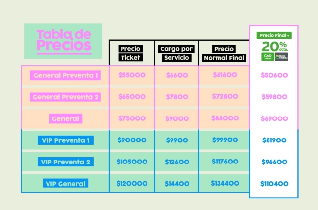Las entradas para el evento estarán disponibles a partir del mediodía en sistema Puntoticket, con un valor general de $84 mil y de $134.400 en VIP, cargo por servicio incluido. En paralelo habrá dos preventas con descuento para quienes hayan asistido a las otras ediciones de Fauna Primavera. Revisa el detalle a continuación: