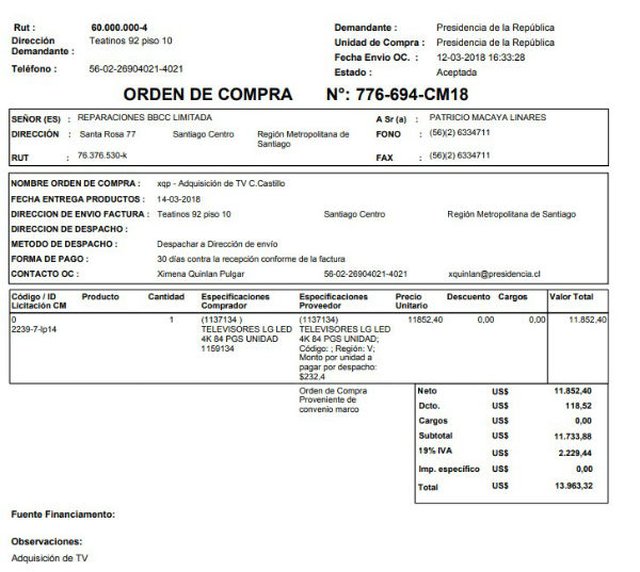 Ahora, se suma a una compra de un televisor de $8,5 millones para ser instalado en la residencia de Cerro Castillo. Se trata de un TV con tecnología 4K y de un tamaño de 84 pulgadas, que tiene un valor de 13.963,32 dólares. Compra que fue autorizada el 14 de marzo recién pasado, es decir, un día después del Cambio de Mando.